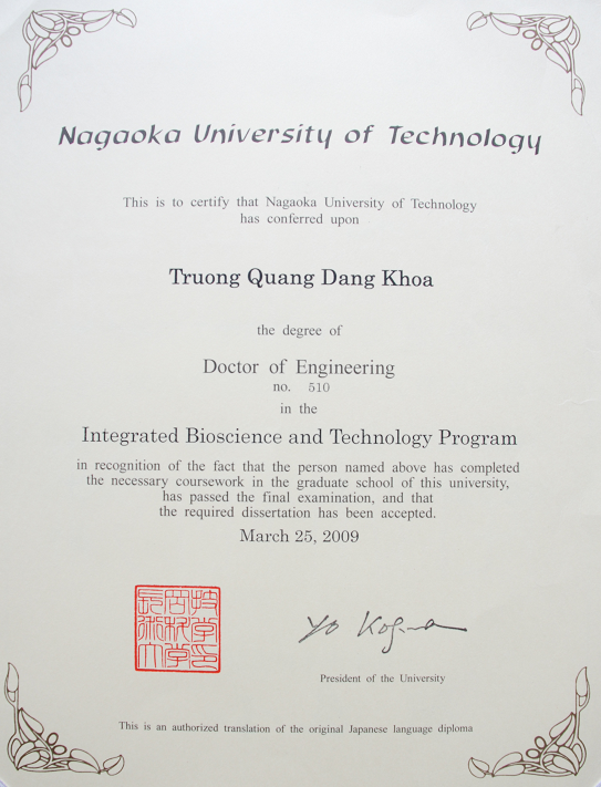 TS. Trương Quang Đăng Khoa, Tiến sĩ tại Đại học Công Nghệ Nagaoka – Nhật Bản